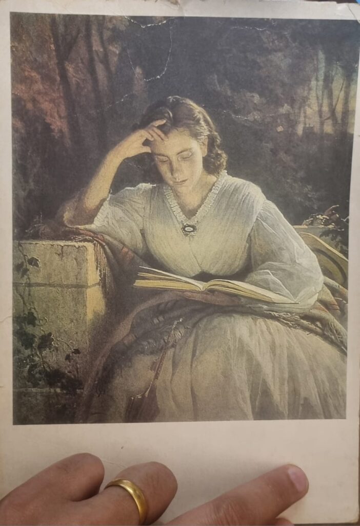 *This image is from a postcard printed in the USSR. I bought it in the 1980s when we had the Soviet festival in India. One of the highlights was a magnificent exhibition of paintings and artefacts on loan from the Hermitage Museum. They had also set up a counter to sell mementos. A beautiful set of postcards featuring painting by various artists was also available.