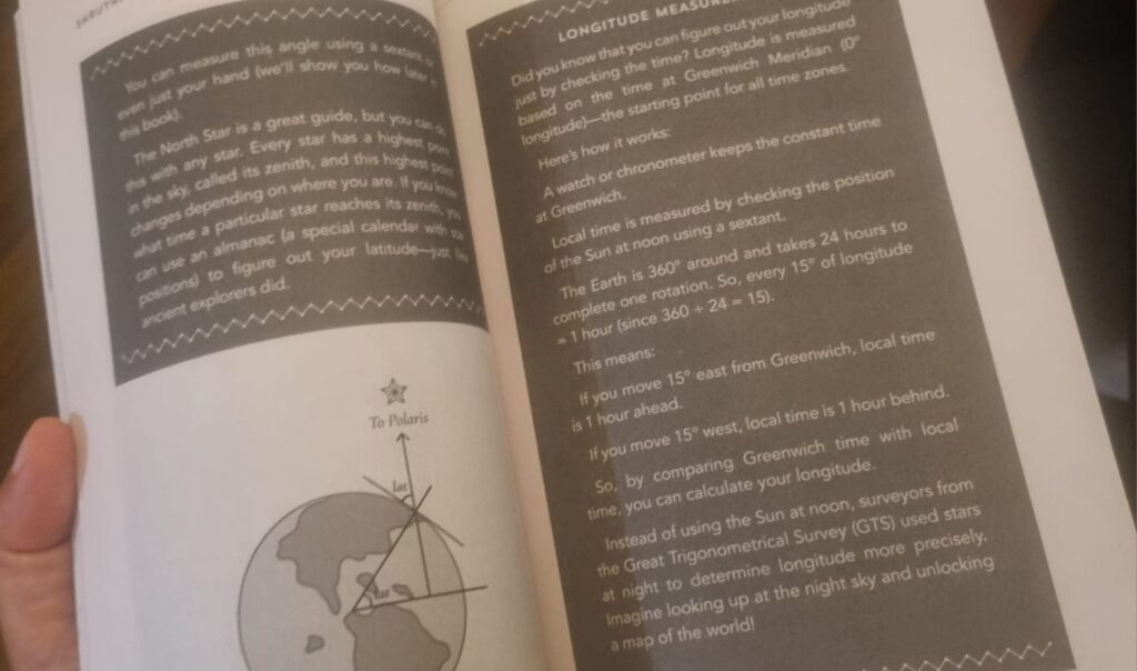 While I get the importance of watching costs in producing a book, surely, exceptions to the rule could have been in the case of India in Triangles. Firstly, when reproducing maps in a book, avoid doing a double page spread where the map falls into the gutter. Consider, printing the map in a folded paper. Make the experience immersive, tactile, and legible. Let the target audience know what it means to open a folded map and pore over it. Secondly, avoid using blurry, black and white print. Try and spend time with the design, even if the original reproduction of the map is of poor quality, and attempt to sharpen the image. It will take many hours to fix but ultimately, it will be worth it. When a book is a pleasure to read, the word spreads very quickly. Finally, even if this title is meant as children’s literature, surely there could have been an attempt to make the information in the boxes easier to read (or just do away with them!). To put faint white print on a dark background is uninteresting, dull and makes the text very difficult to read. Why is the joy taken out of reading because of the constant emphasis on cost? Surely, a decent balance can be struck between the two factors.