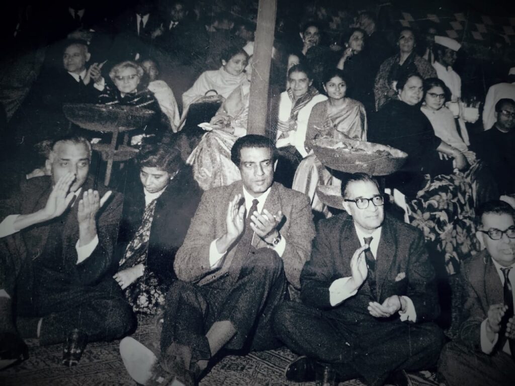 L to R, sitting on the ground: My maternal grandfather, Nirmal Mukarji, anonymous lady, Satyajit Ray, and my granduncle & Madhuri’s paternal grandfather, Kaushal K. Dass who was then Secretary, Information and Broadcasting, Govt. of India. Seated on the right of the pillar is my grandmother, Premilla Mukarji.