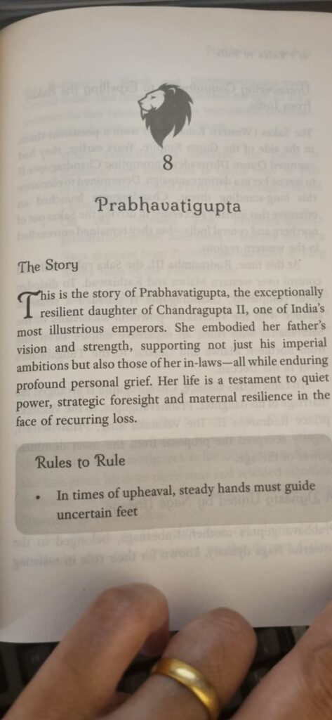 In Rules to Rule, the author, Prashant Anand distills timeless lessons from ancient Indian rulers into a practical guide for modern readers. It is quite simply written. There is a biography and significant achievements of the historical figure followed by a pithy analysis on what a modern reader can glean from a life well lived. The people profiled are: Chandragupta Maurya, Bindusara, Ashoka, Pushyamitra Shunga, Karikala Chola, Samudragupta, Chandragupta II, Prabhavatigupta, Kanishka, Gautamiputra Satakarni, Harshavardhana, Pulakeshin II, Narasimhavaraman I, Dantidurga, Dhruva, Amoghvarsha and Krishna III, Mayurasharma, Mithira Bhoja, Dharmapala, Rajaraja Chola and Rajendra Chola. It is an interesting mix of figures.